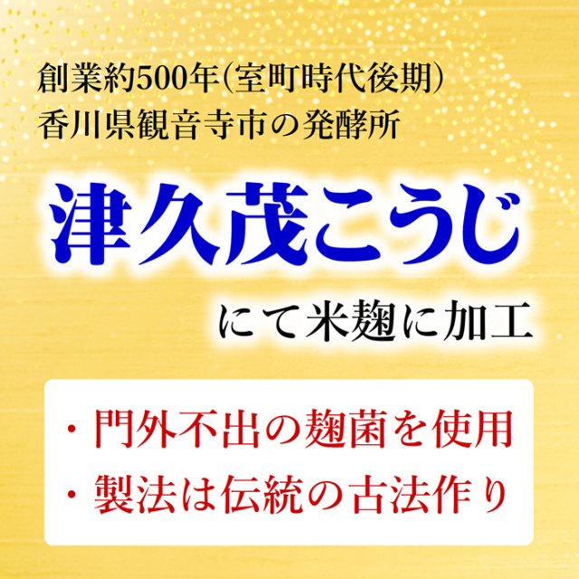 米麹への加工は創業約500年の歴史を持つ香川県観音寺市の発酵所「津久茂こうじ」にて行っています。